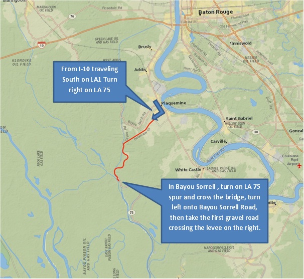 Local officials estimate 50 to 100 boats a day are using the launch area over the weekends. To find the launch, start at Hwy 1 in Plaquemine, go to LA 75 to Bayou Sorrell, turn on LA 75 spur and cross the bridge, turn left onto Bayou Sorrell Road, then take the first gravel road crossing the levee on the right.